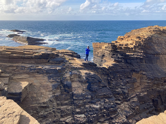 We walk back up to the apartment to eat sandwiches and recombobulate, then set out in the car for Yesnaby. We've seen a picture of some striking cliffs on a tourist map and have decided to go see if we can find them. We don't actually find the place we saw on the map, but what we do find is incredible anyway. We drive right up to the edge of the world, where Orkney drops off sharply into the violent North Sea. The briny wind whips our coats around us, and we bundle up to endure the harsh environment. We carefully approach the unguarded cliff edges to see the sea thrashing the sharp rocks below. Falling here would mean death, and it wouldn't be hard to stumble. The rocks are mostly flat, but jagged, broken, and tilted toward the sea. There are plenty of places to trip up if you're not careful.